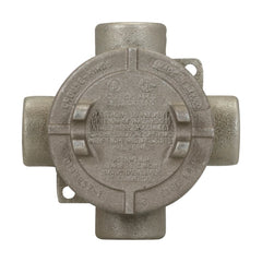 Eaton Crouse-Hinds series Condulet EAJ conduit outlet box with cover, 3-3/16" cover opening diameter, Feraloy iron alloy, X shape, 1/2"
