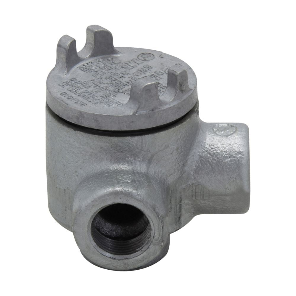 Eaton Crouse-Hinds series Condulet GUA conduit outlet box with cover, 2" cover opening diameter, Feraloy iron alloy, M shape, 3/4"