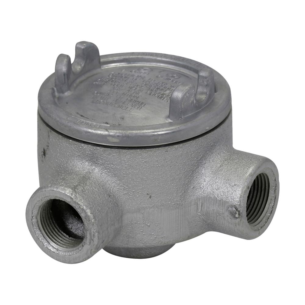 Eaton Crouse-Hinds series Condulet GUA conduit outlet box with cover, 3" cover opening diameter, Feraloy iron alloy, M shape, 3/4"