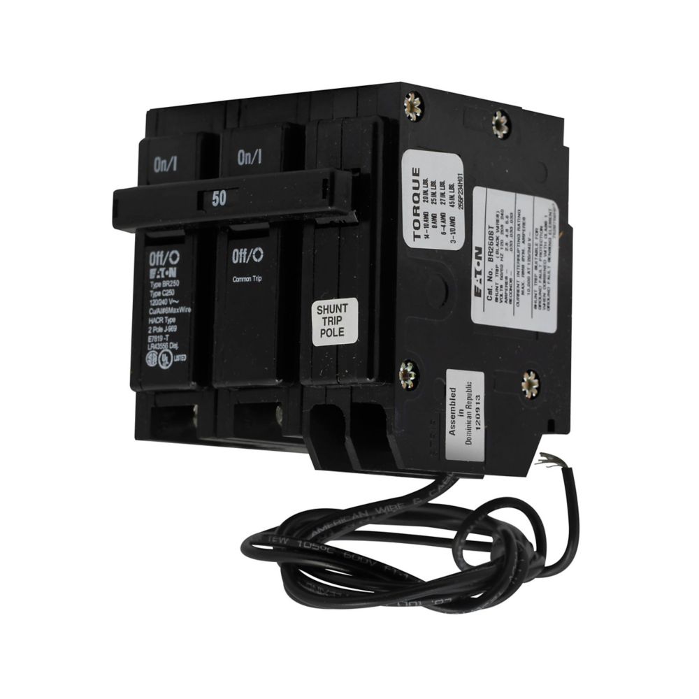 Eaton BR thermal magnetic circuit breaker,Type BR 1-Inch plug-on shunt trip circuit breaker,15 A,10 kAIC,Two-pole,120/240V,BR,Common breaker trip,#14-4 AWG Cu/Al,BR,Type BR Loadcenters,Shunt trip included