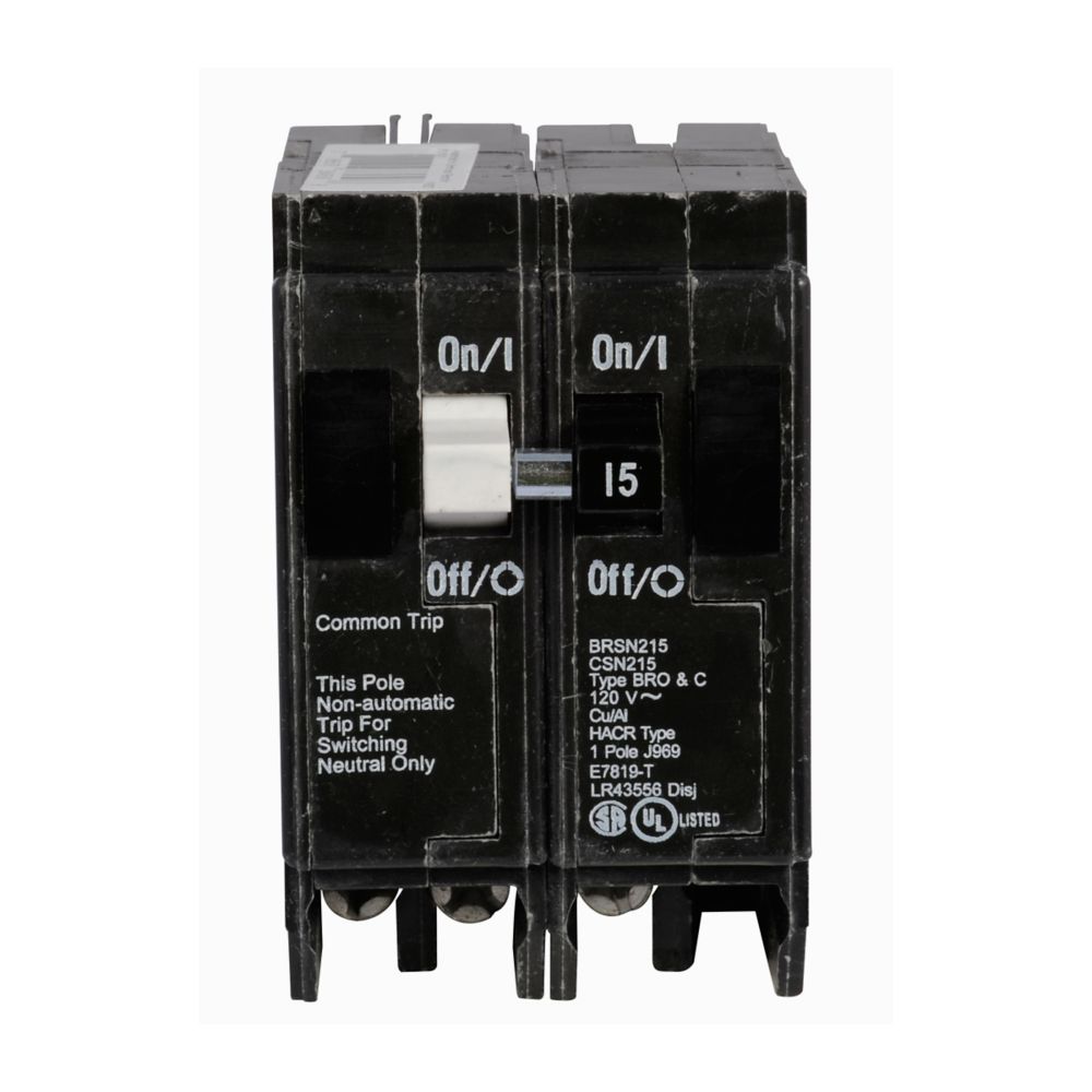 Eaton BR thermal magnetic circuit breaker,Type BR 1-Inch switching neutral breaker,15 A,10 kAIC,Two-pole,120V,BR,Switching neutral,#14-4 AWG Cu/Al,BR,Type BR Loadcenters