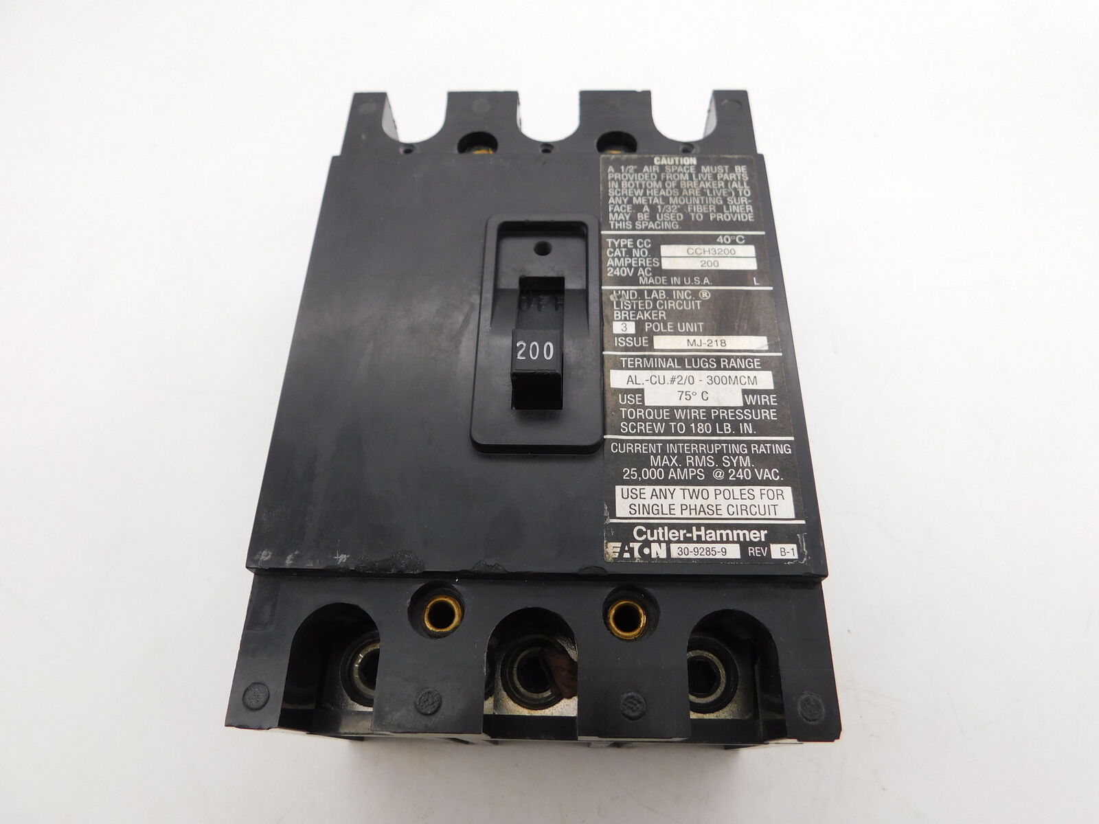 Eaton CC enclosed breaker,Molded case breaker,High interrupting capacity,200 A,100 kAIC,Three-pole,240 V,!,#2/0 AWG-300 kcmil Cu/Al,CCH,Type ECC Unit enclosures,120 V Shunt trip