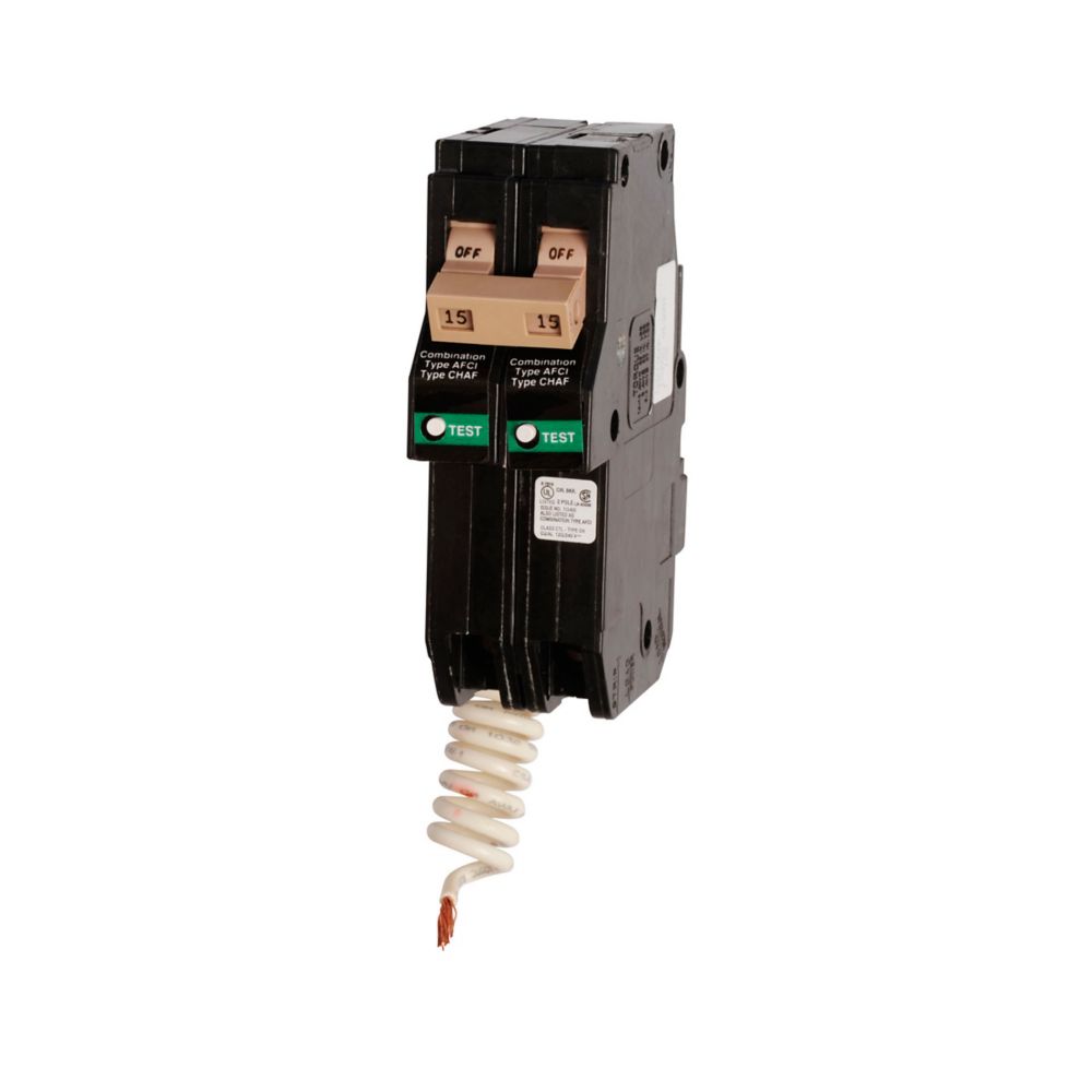 Cutler Hammer's CH215CAF is a Type CH molded case circuit breaker featuring a combination of arc-fault and earth leakage protection. With a 15A capacity at 120/240V, it ensures comprehensive circuit safety.