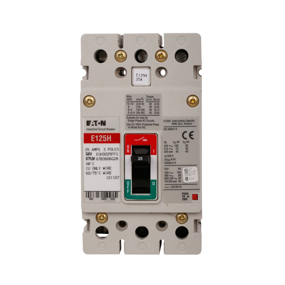 Eaton Series G molded case circuit breaker, EG-frame, EG, Complete breaker, Fixed thermal, fixed magnetic trip, Three-pole, 25A, 600Y/347 Vac, 100 kAIC at 240 Vac, 65 kAIC at 480 Vac, 35 kAIC at 600Y/347 Vac, Bolt-on, 50/60 Hz