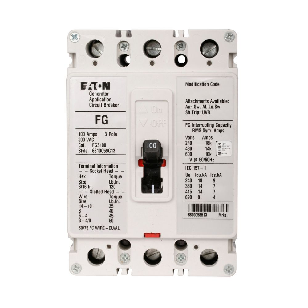 Eaton Series C complete EG molded case circuit breaker, F-frame, FG, Fixed thermal and magnetic trips, Three-pole, 125A, 600 Vac, 18 kAIC at 240 Vac, 14 kAIC at 480 Vac, Line/load, Engine generator, Reverse, 60 Hz, Fixed