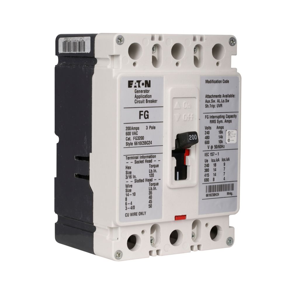 Eaton Series C complete EG molded case circuit breaker, F-frame, FG, Fixed thermal and magnetic trips, Three-pole, 200A, 600 Vac, 18 kAIC at 240 Vac, 14 kAIC at 480 Vac, Line/load, Engine generator, Reverse, 60 Hz, Fixed
