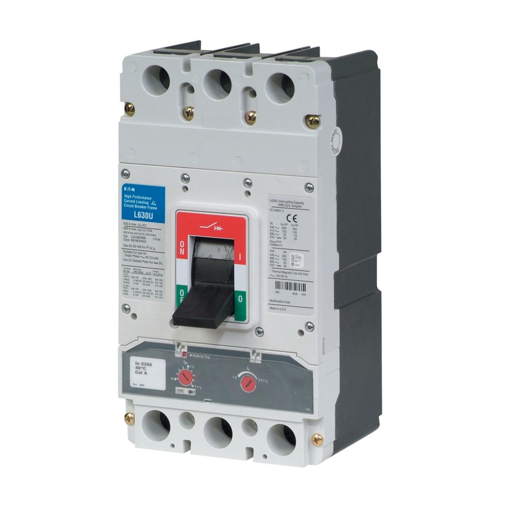 Eaton Series G molded case circuit breaker, LG-frame, LG, Frame only, Fixed thermal, fixed magnetic trip type, Three-pole, 630A, 600 Vac, 200 kAIC at 240 Vac, 150 kAIC at 415 Vac, 150 kAIC at 480 Vac, 65 kAIC at 600 Vac, Without terminals