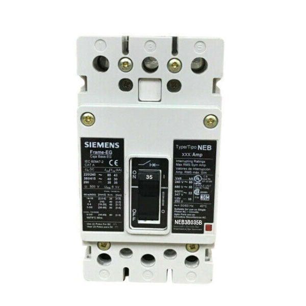 SIEMENS LOW VOLTAGE PANELBOARD MOUNT EG FRAME CIRCUIT BREAKER WITH THERMAL - MAGNETIC TRIP UNIT. UL LISTED NEB FRAME WITH STANDARD BREAKING CAPACITY. 35A 3-POLE (22KAIC AT 600Y/347V) (35KAIC AT 480V). SPECIAL FEATURES: LOAD SIDE LUGS ONLY (TA1EG10) WIRE RANGE: 8 - 1/0 AWS (CU/AL). DIMENSIONS (W x H x D) IN: 3 x 5.5 x 3.