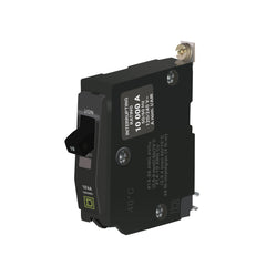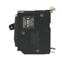 Square D bolt-on circuit breaker has a voltage rating of 120/240 Volts current rating of 10 Amps and interrupting rating of 10 kilo-Amps. The 1-Pole thermal magnetic circuit breaker features a lug terminal and accommodates aluminum/copper wire size of 14 - 8 AWG.
