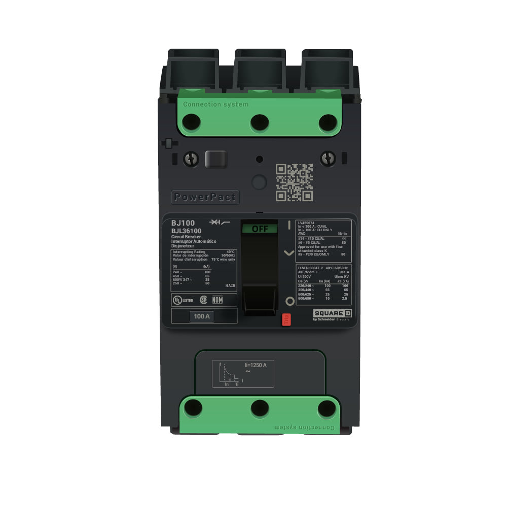 PowerPacT B-Frame brings thermal-mechanical circuit protection in a compact size and offers a wide range of accessories, auxiliaries, and connection options. This PowerPacT B-Frame circuit breaker provides thermal magnetic circuit protection with a breaking capacity of 25kA at 600Y/347VAC. All PowerPacT B-Frame circuit breakers are equipped with dual-break rotating contacts that reduce the amount of peak current during a short circuit fault. All PowerPacT circuit breakers have an integral push-to-trip button in the cover to manually trip the circuit breaker. PowerPacT B-Frame circuit breakers come in 1 to 4-pole unit mount construction and in 1 to 3-pole I-Line construction. This circuit breaker's unit mount construction features traditional back pan mounting with screws or integrated DIN rail mounting for installation flexibility. This unit features EverLink lugs, a patented design to reduce loosening of cables over time, on both termination ends. This PowerPacT B, 100A, 3 pole, circuit breaker has a breaking capacity of 25kA at 600Y/347VAC. This circuit breaker has a continuous current rating of 80%. PowerPacT B circuit breakers comply to UL, CSA, NOM, and IEC standards and are CE marked.