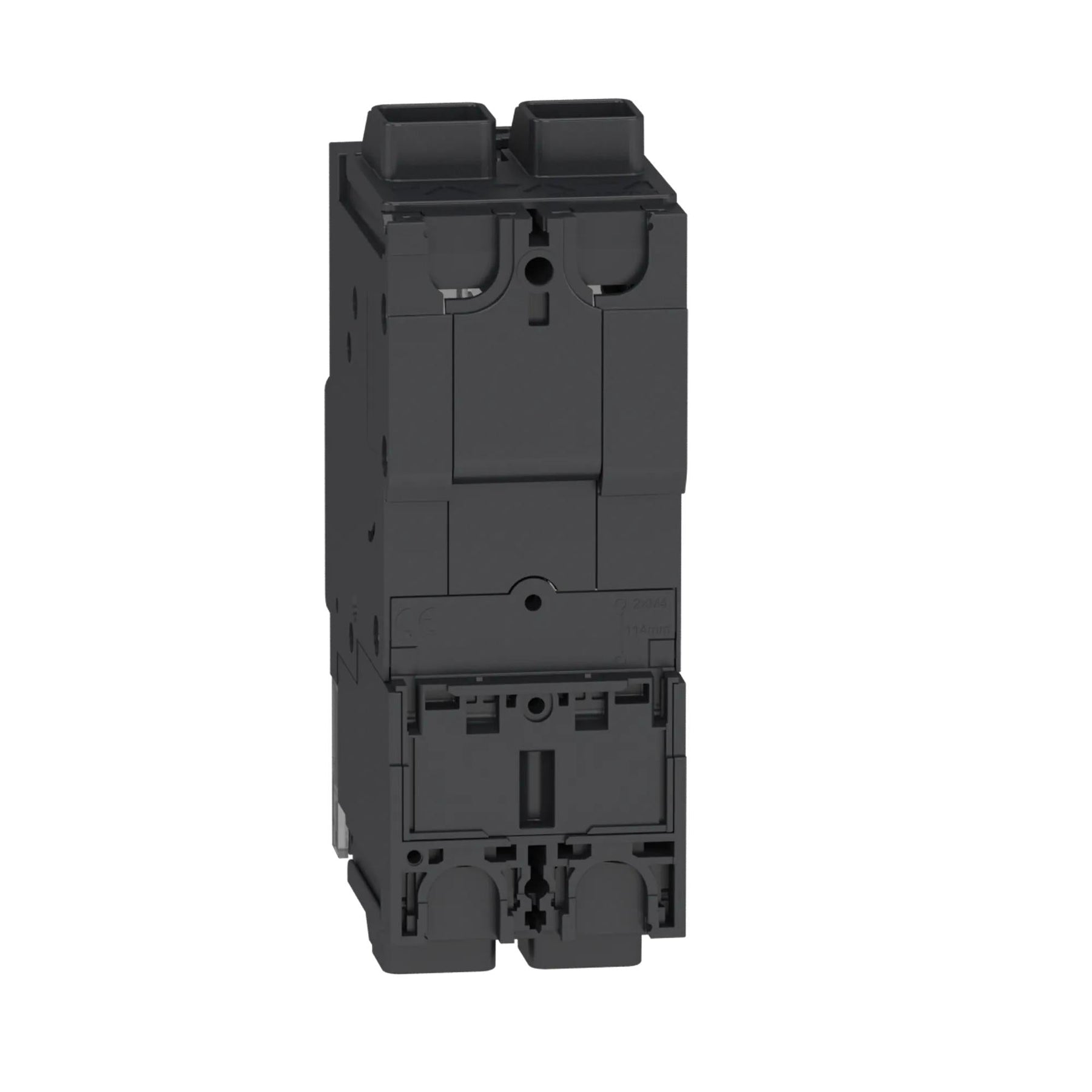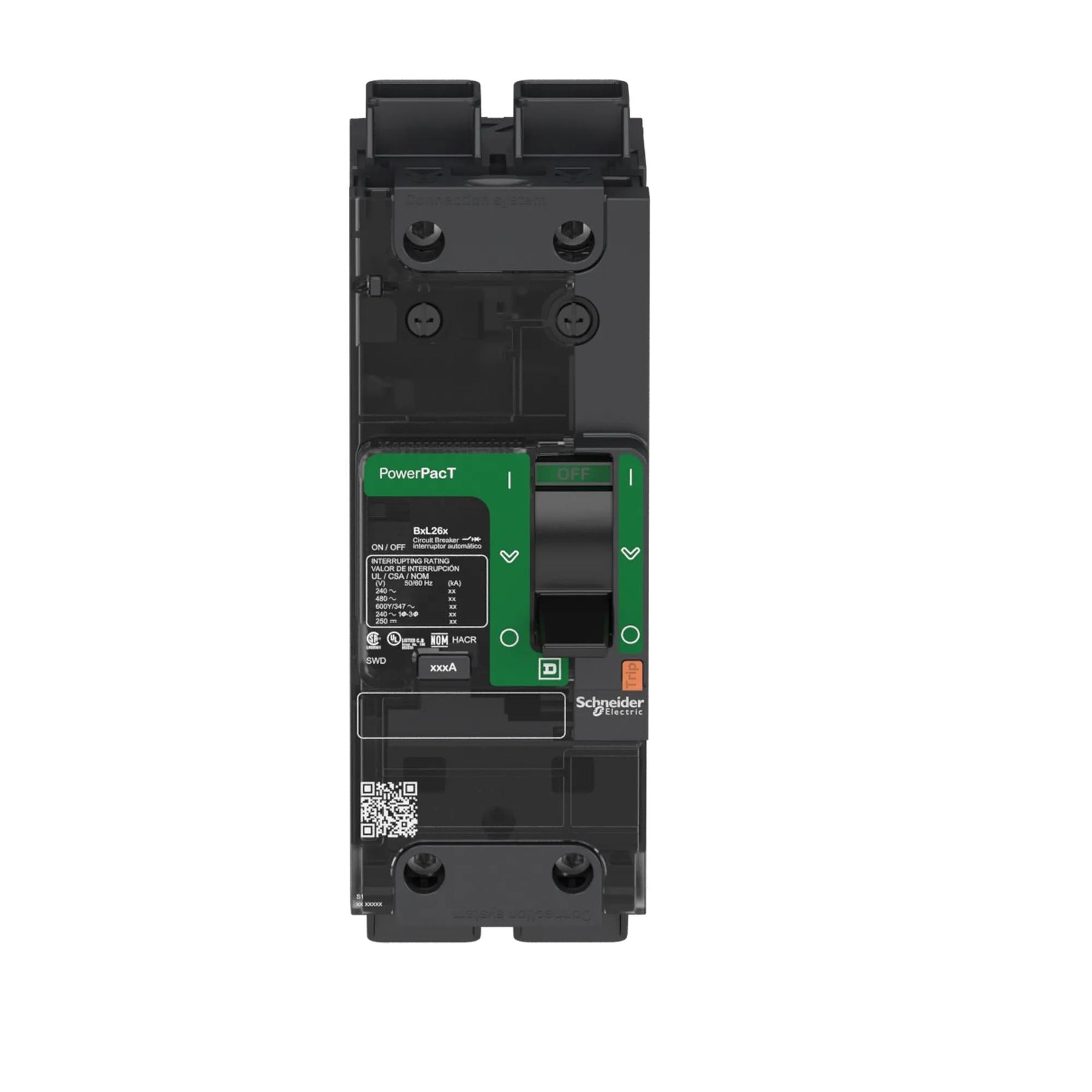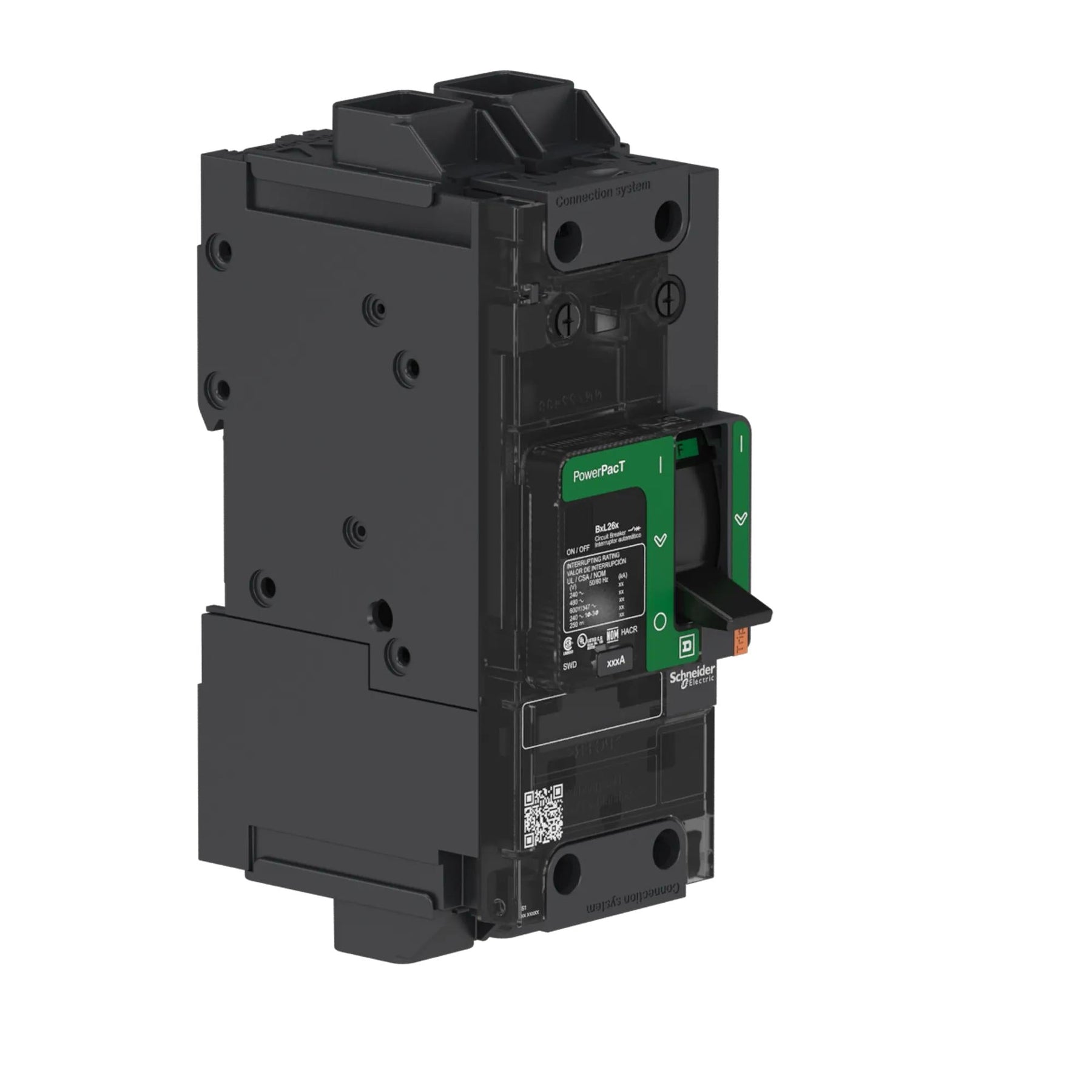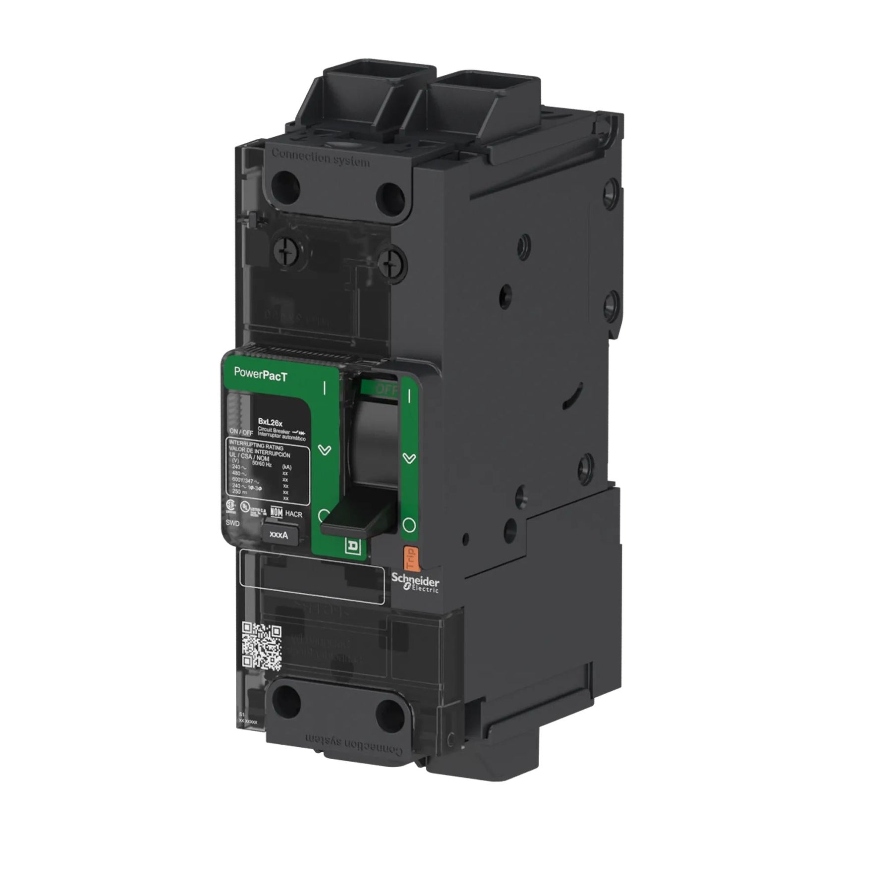 PowerPacT B-Frame brings thermal-mechanical circuit protection in a compact size and offers a wide range of accessories, auxiliaries, and connection options. This PowerPacT B-Frame circuit breaker provides thermal magnetic circuit protection with a breaking capacity of 14kA at 600Y/347VAC. All PowerPacT B-Frame circuit breakers are equipped with dual-break rotating contacts that reduce the amount of peak current during a short circuit fault. All PowerPacT circuit breakers have an integral push-to-trip button in the cover to manually trip the circuit breaker. PowerPacT B-Frame circuit breakers come in 1 to 4-pole unit mount construction and in 1 to 3-pole I-Line construction. This circuit breaker's unit mount construction features traditional back pan mounting with screws or integrated DIN rail mounting for installation flexibility. This unit features EverLink lugs, a patented design to reduce loosening of cables over time, on both termination ends. This PowerPacT B, 60A, 2 pole, circuit breaker has a breaking capacity of 14kA at 600Y/347VAC. This circuit breaker has a continuous current rating of 80%. PowerPacT B circuit breakers comply to UL, CSA, NOM, and IEC standards and are CE marked.