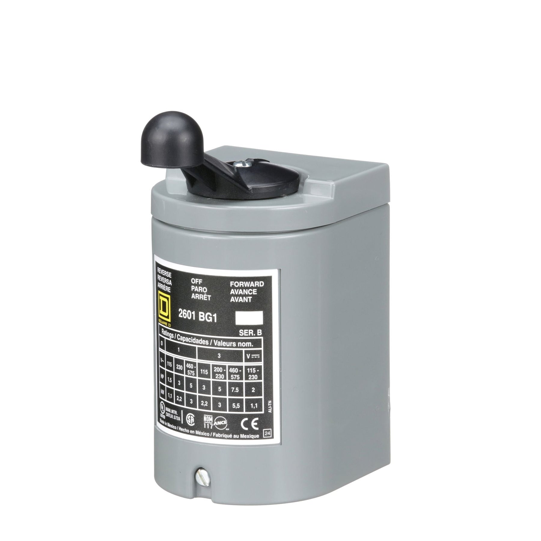 2601 reversing drum switches are designed to start and reverse motors by connecting them directly across the line. The devices can be used with squirrel cage and single-phase motors designed for reversing service. Can be used with AC or DC motors. Drum switches are field convertible from maintained to momentary operation. A variety of enclosures are available. This device has a NEMA 1 general purpose enclosure. Drum switches are UL listed and CSA certified for global applications.