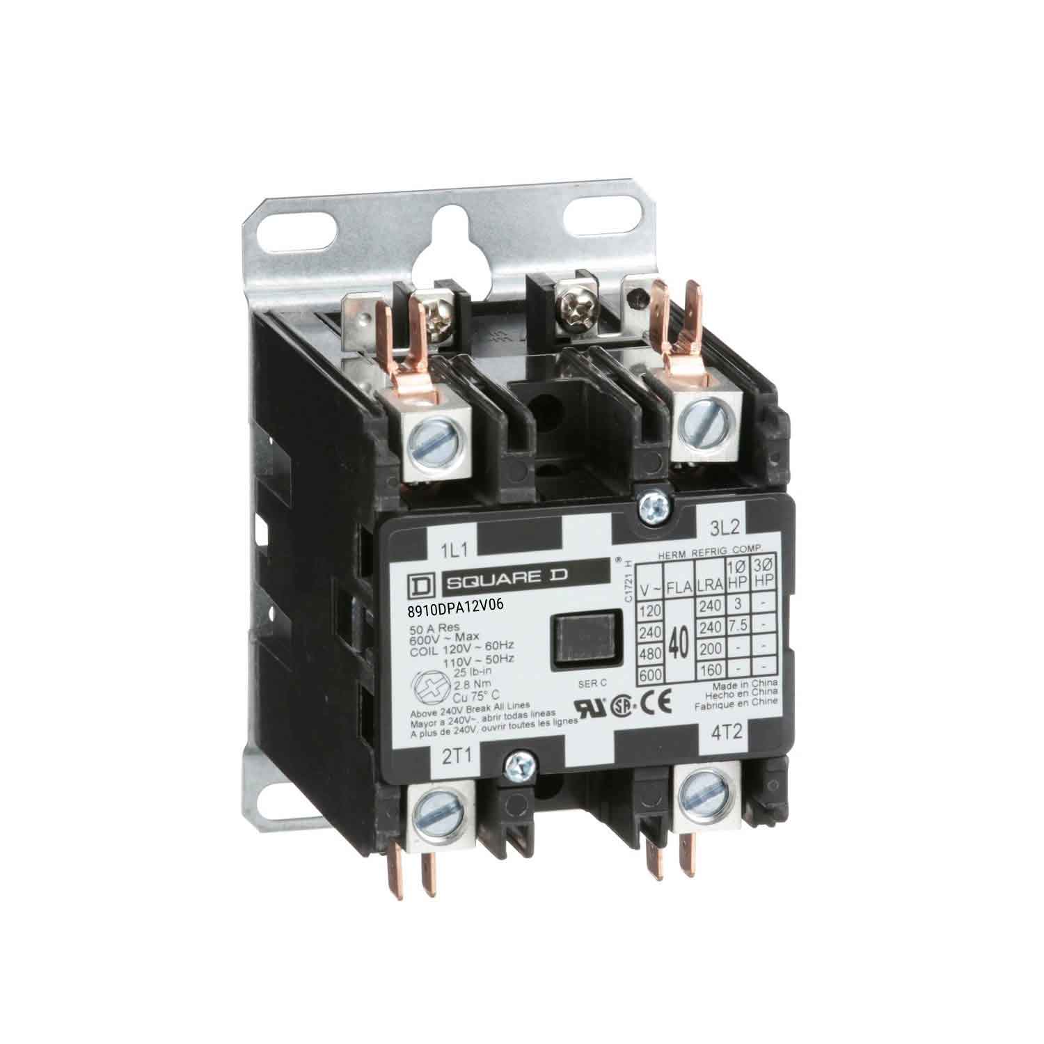 8910DPA12V06, Square D, Class 8910, type DPA, definite purpose contactor, 5HP @ 230V, 7.5HP @ 460/575V, 2P, 1PH, 20A, 600V, complete with 480V coil