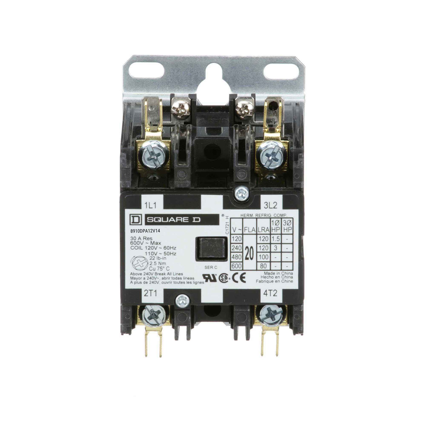8910DPA12V14, Square D, Class 8910, type DPA, definite purpose contactor, 5HP @ 230V, 7.5HP @ 460/575V, 2P, 1PH, 20A, 600V, complete with 24V coil
