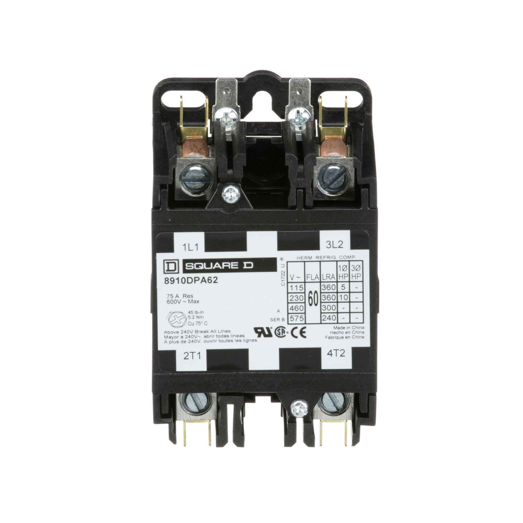 8910DPA62V02, Square D, Class 8910, type DPA6, definite purpose contactor, 25HP @ 230V, 30HP @ 460/575V, 2P, 1PH, 60A, 600V, complete with 120V coil