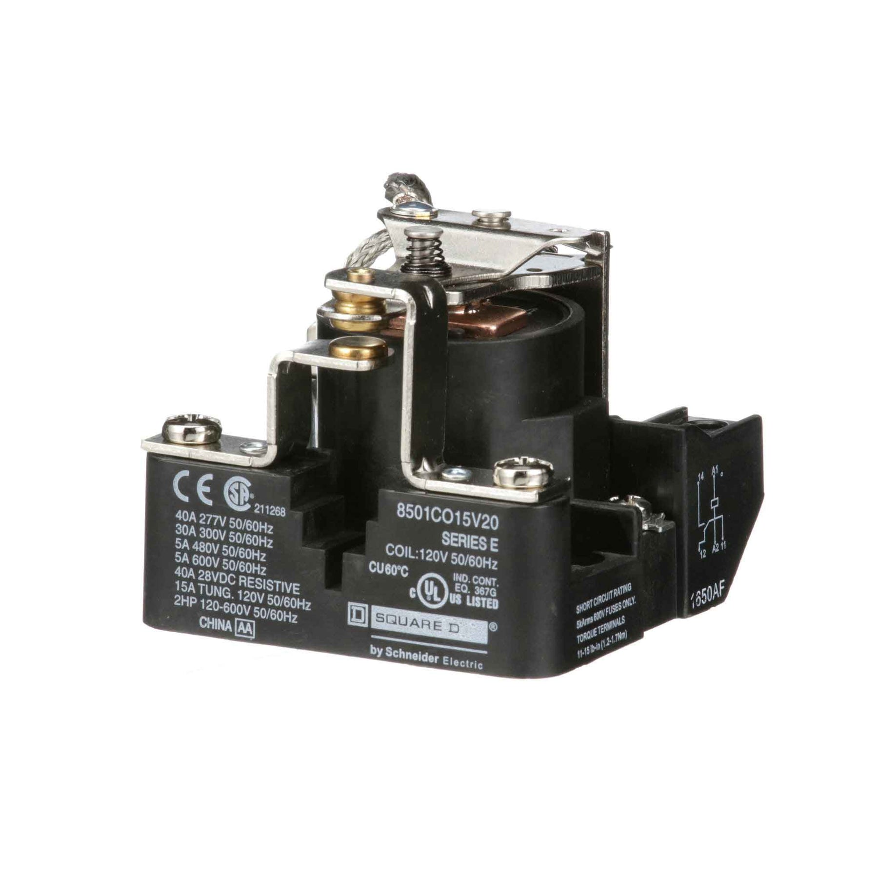 8501CO15V20, Square D, Class 8501, motor control part and accessory, Relays, type C, UL listed, CSA certified, 1 N.O. / 1 N.C. fixed contacts, complete with 120 VAC 50/60Hz standard coil, 300V/600V, 30A @ 300Vac, 5A @ 600Vac, suitable for use with Class 8501 motor control systems