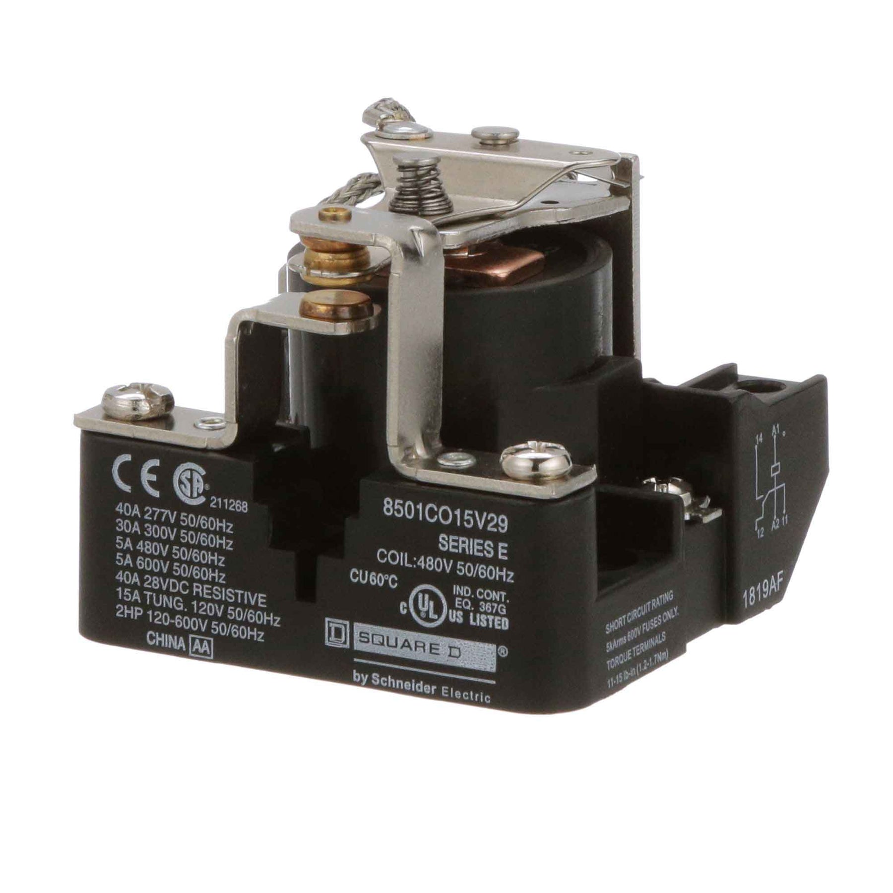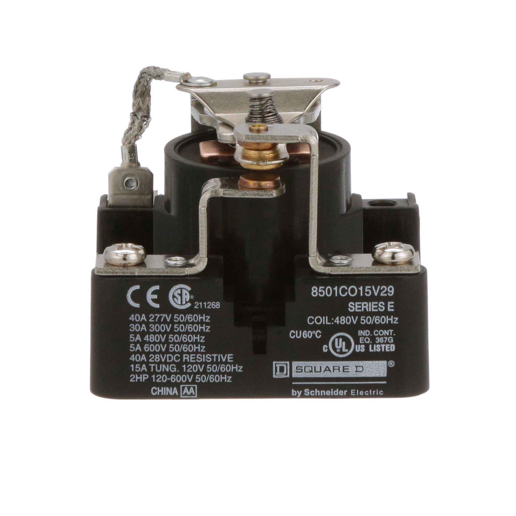 8501CO15V29, Square D, Class 8501, motor control part and accessory, Relays, type C, UL listed, CSA certified, 1 N.O. / 1 N.C. fixed contacts, complete with 480 VAC 50/60Hz standard coil, 300V/600V, 30A @ 300Vac, 5A @ 600Vac, suitable for use with Class 8501 motor control systems