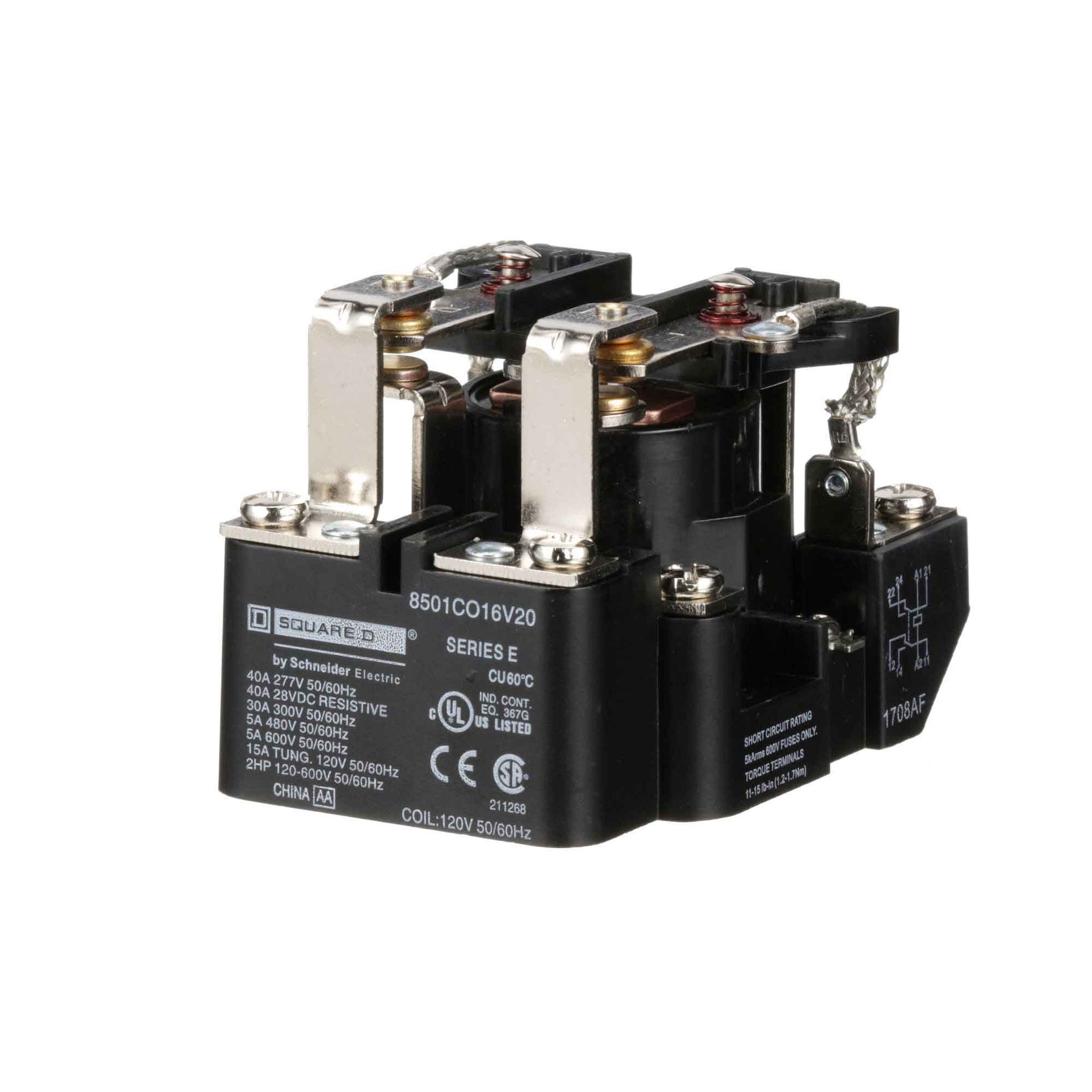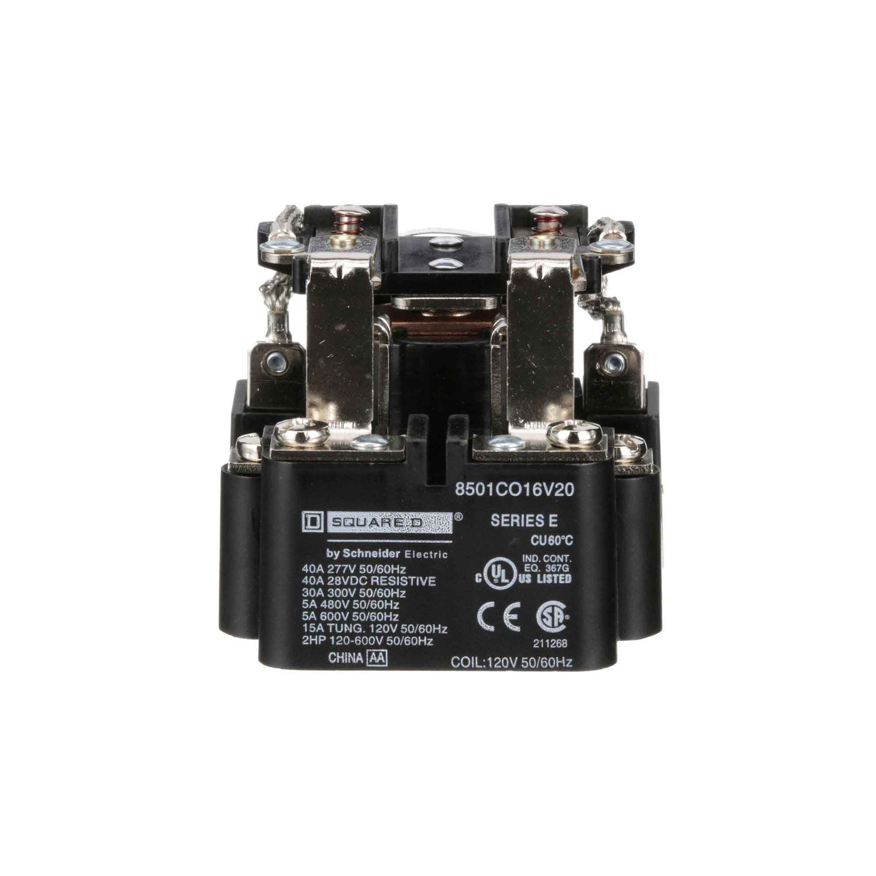 8501CO16V20, Square D, Class 8501, motor control part and accessory, Relays, type C, UL listed, CSA certified, 2 N.O. / 2 N.C. fixed contacts, complete with 120 VAC 50/60Hz standard coil, 300V/600V, 30A @ 300Vac, 5A @ 600Vac, suitable for use with Class 8501 motor control systems