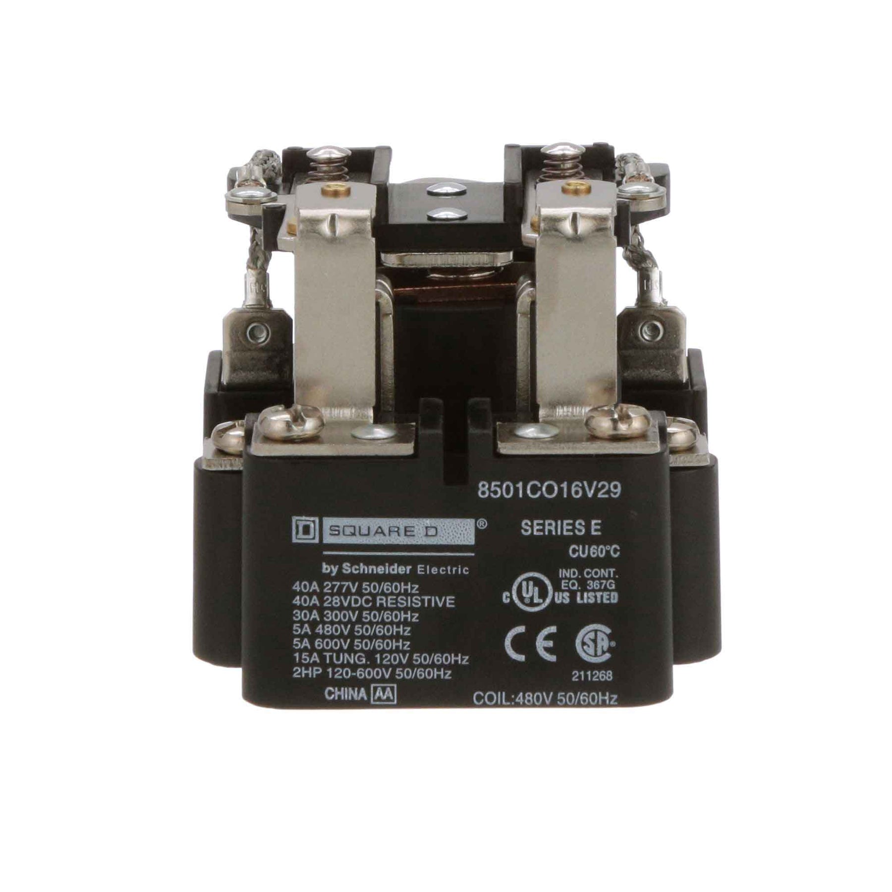 8501CO16V29, Square D, Class 8501, motor control part and accessory, Relays, type C, UL listed, CSA certified, 2 N.O. / 2 N.C. fixed contacts, complete with 480 VAC 50/60Hz standard coil, 300V/600V, 30A @ 300Vac, 5A @ 600Vac, suitable for use with Class 8501 motor control systems