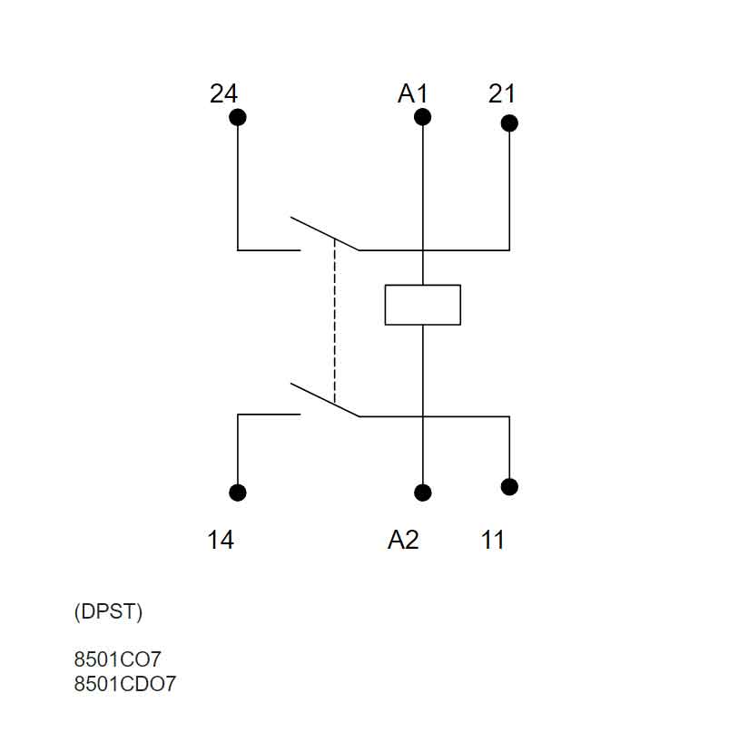 8501CO7V14, Square D, Class 8501, motor control part and accessory, Relays, type C, UL listed, CSA certified, 2 N.O. Fixed contacts, complete with 24 VAC 50/60Hz standard coil, 300V/600V, 30A @ 300Vac, 5A @ 600Vac, suitable for use with Class 8501 motor control systems