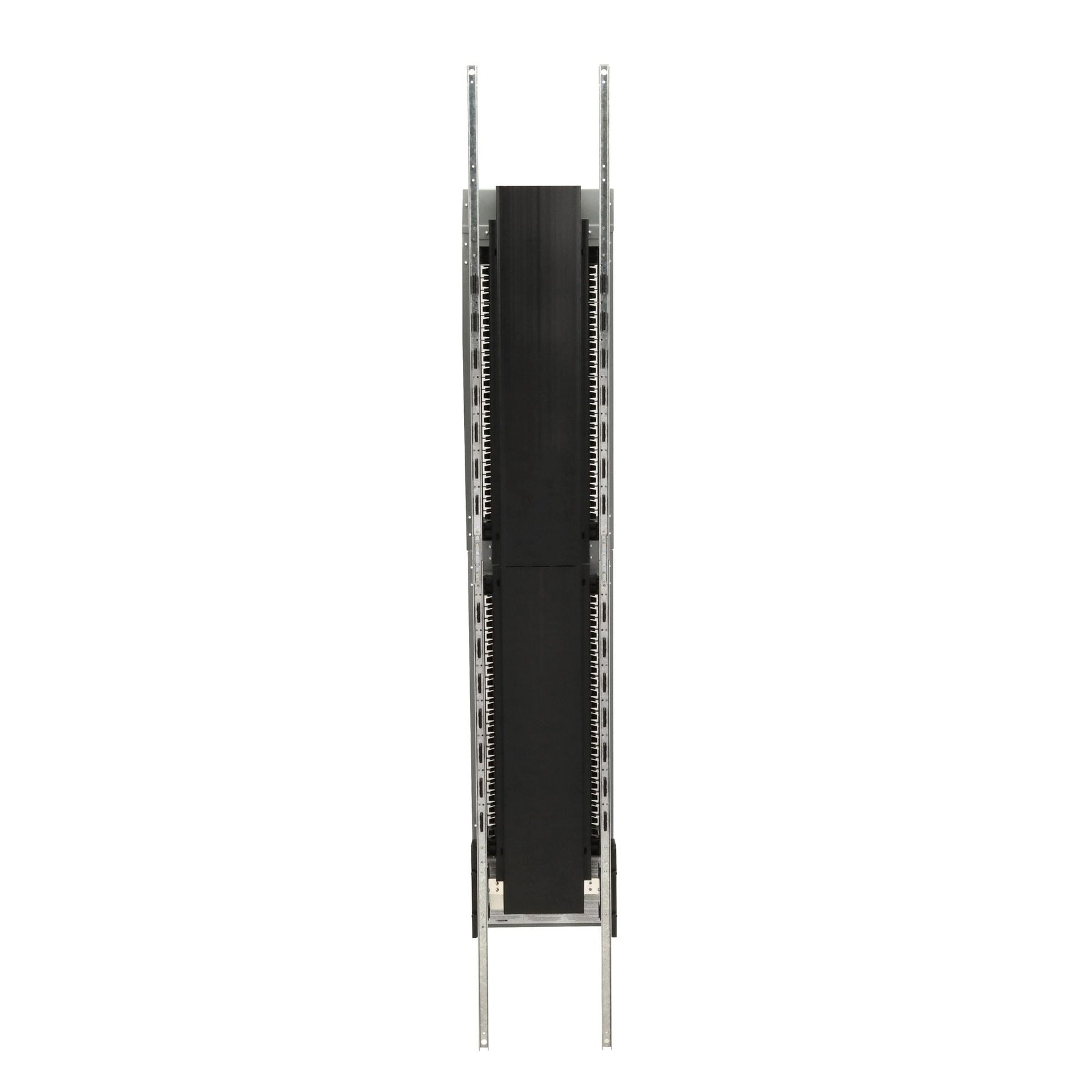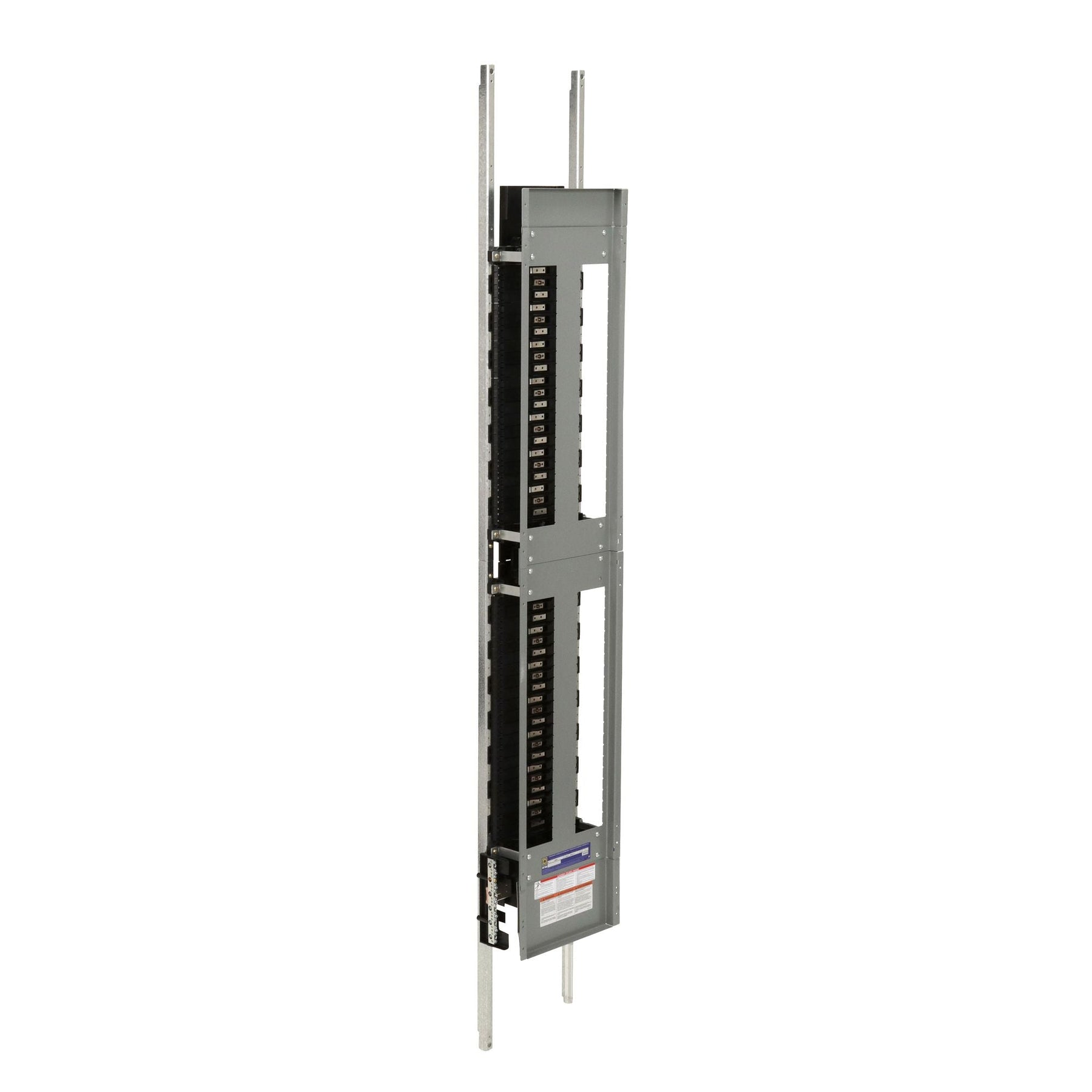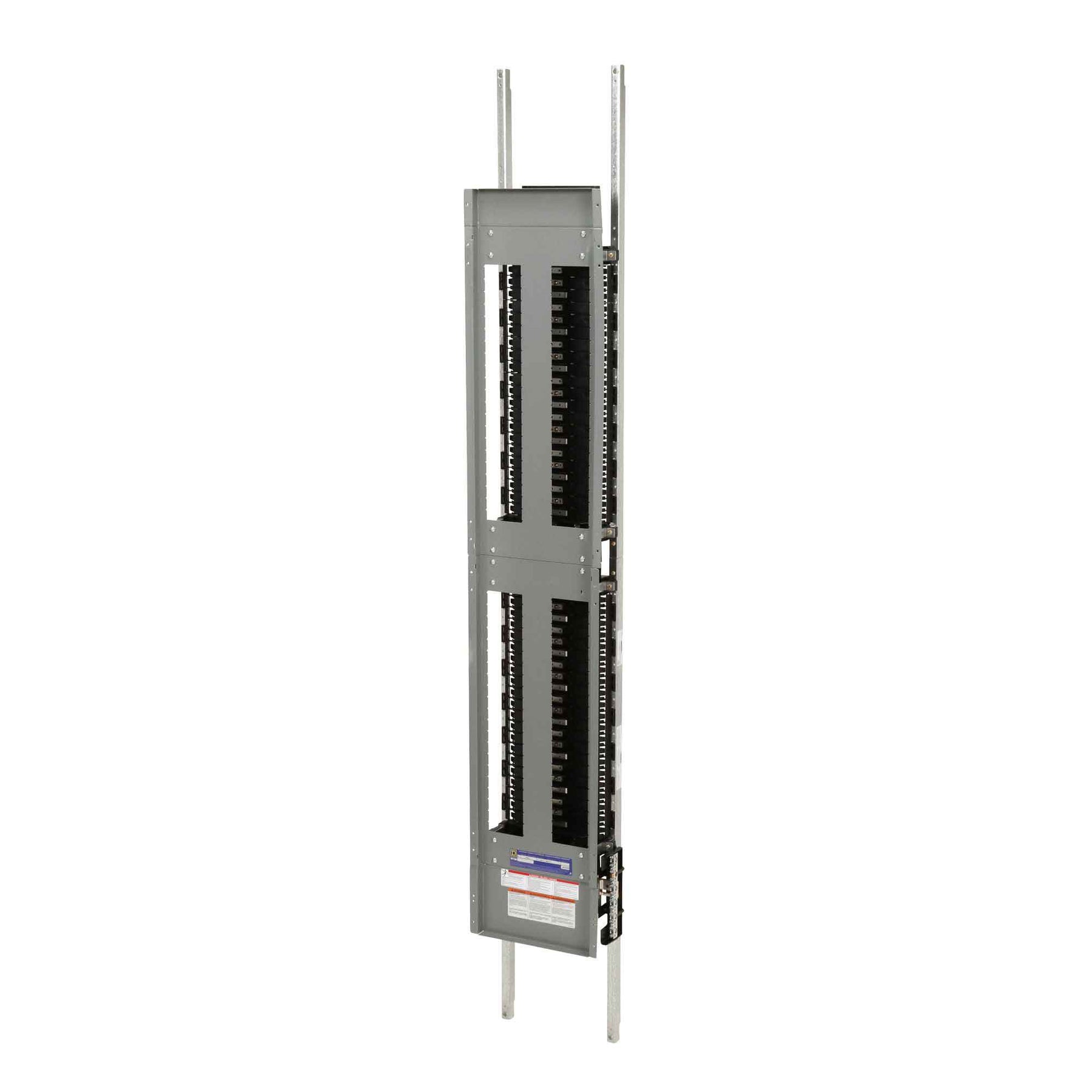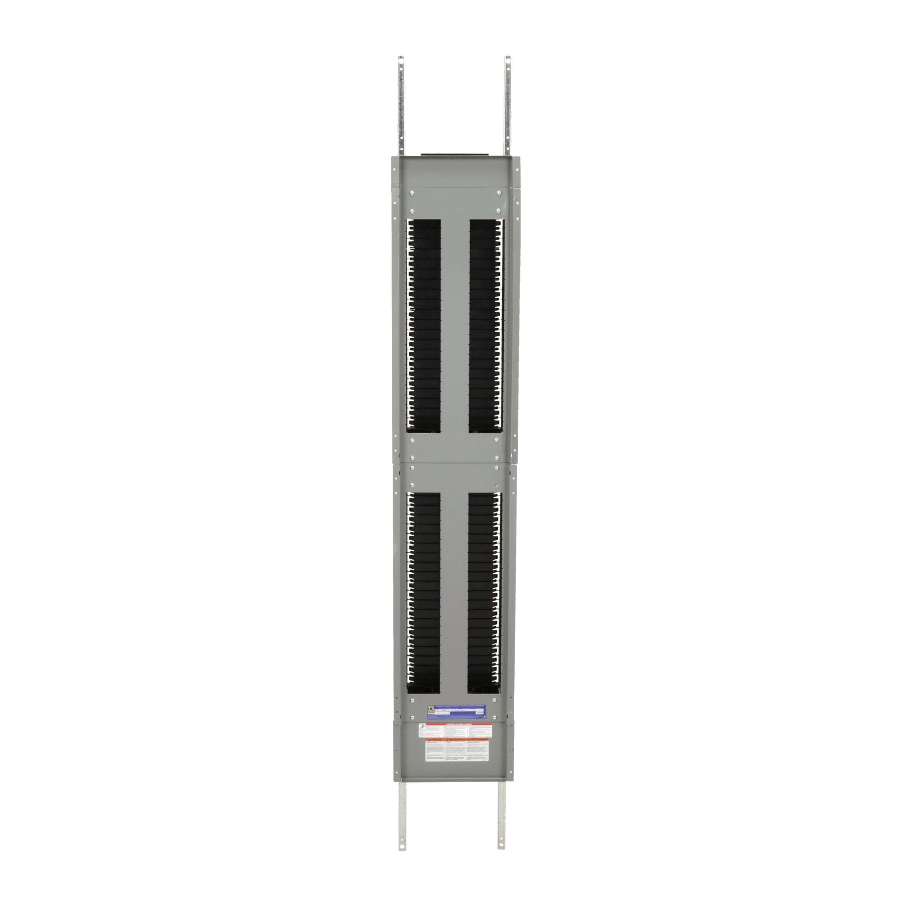 NF Panelboard interiors can be used for applications such as commercial buildings, industrial buildings, stadiums, and offices. These interiors provide protection for commercial and industrial applications. NF Panelboards feature a wide selection of circuit breakers, accessories, and ready to install kits. NF Panelboards are field convertible to top or bottom feed. NF Panelboards are convertible from main lug to main breaker. NF Panelboards can provide 200% rated neutrals for nonlinear loads. Some factory installed options are split bus, lighting contactors, compression lugs, surge protection devices, and phenolic nameplates. The main lugs are rated at 400A 600Y/347 VAC 3 phase. Interior has an interrupt current rating of up to 65 kA. This interior is for a 4 wire system with 84 spaces and has an aluminum bus bar. Interior is for EDB, EDG, and EDJ branch circuit breakers. Line lug connections will accept 1/0 AWG to 750 kcmil aluminum wire. The interior is 86 inches tall and 10.44 inches wide. This interior is UL listed and CSA certified.