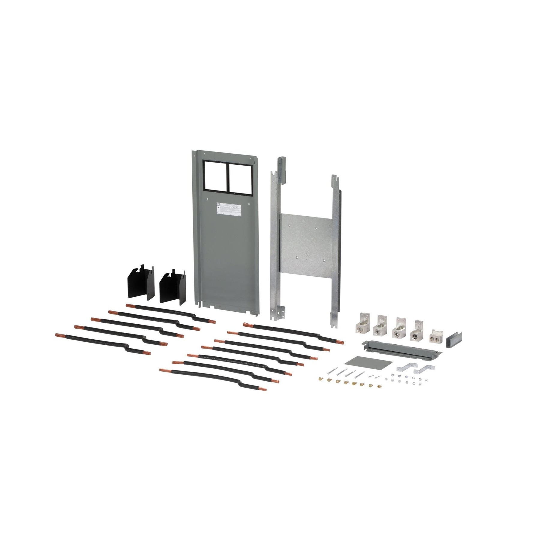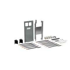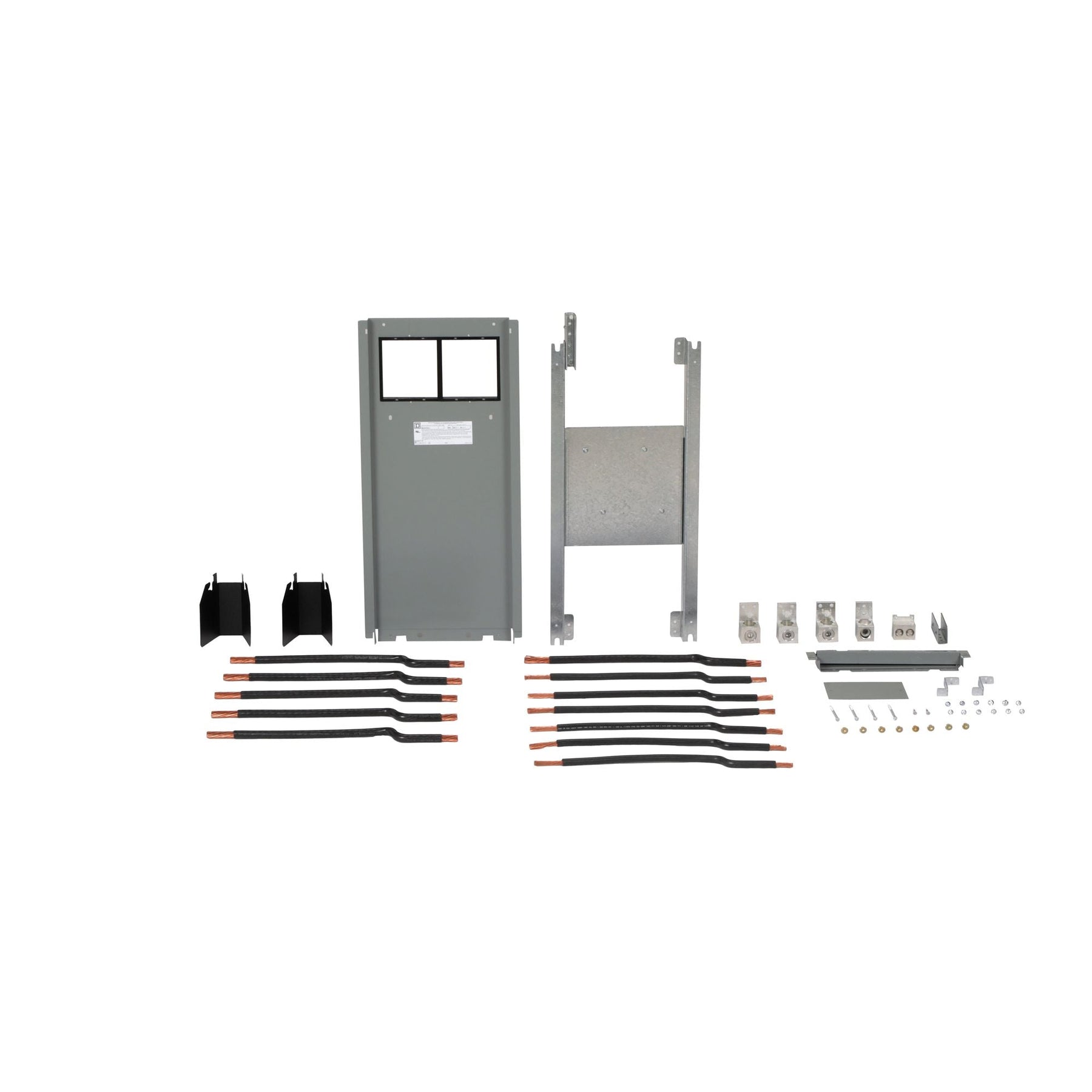This dual subfeed circuit breaker and adapter kit is an accessory of the Schneider Electric™ NQ 240VAC lighting and appliance panelboards, allowing greater power routing flexibility. The kit provides the option of easily connecting circuit breakers downstream of a main lug or main circuit breaker panelboard. The kit includes a subfeed circuit breaker deadfront cover, support brackets, mounting pan assembly, rail splice, closing plate, neutral and load lugs, lug barriers, branch neutral lug insulator, main lug wires, and tapping screws. The structure accepts 2 or 3 pole breakers and can fit one or two PowerPact H- or J-Frame molded case circuit breakers rated up to 225A. The kit is compliant with CULus standards.